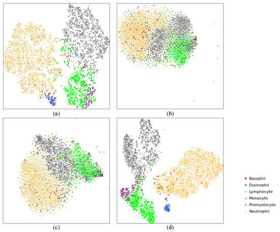 The learned features of the four networks were visualized to show the learning ability of different networks on our task through the t-SNE method [38]. The high dimensional features obtained by the last layer of each model were projected to the Cartesian coordinates as plotted in Figure 5. The features extracted by ResNet-34 and ResNeXt-50 did not achieve gratifying divisibility due to the overlaps. However, for VGG-19, several eosinophil and basophil scatters located inside the neutrophil cluster that causes the misclassification. It revealed the reason why the classification performance of VGG-19 is relatively poor.