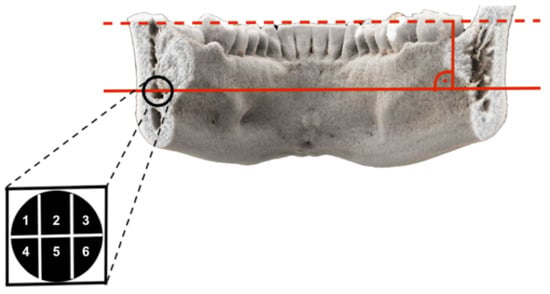 The coronal layer of the 3D-DESS MRI reconstructions with the closest positional relationship between the IAN and the MTM, representing the clinically most relevant and dangerous zone in the surgery of impacted MTMs, was the selected reference image for the precise intraosseous IAN anatomy determination. A horizontal line was placed on the selected reference layer through the alveolar crest of the buccal cortical plate at the height of the third molar on the left and right sides. A parallel line was placed through the midpoint of the IAN, whereby the section representing the intraosseous diameter of the IAC was divided by two perpendiculars resulting in six segments: segment one, upper buccal segment; segment two, upper middle segment; segment three, upper lingual segment; segment four, lower buccal segment; segment five, lower middle segment; and segment six, lower lingual segment (Figure 1). If half or more than half of the segment’s volume is filled with MRI signal hyperintensities of the IAN, it is considered visible. However, if less than half to none of the segment’s volume is filled with MRI signal hyperintensities, it is considered non-visible (Figure 2). To investigate the influence of the impacted MTM’s position on the intraosseous IAN position, the same evaluation was performed at the distal root of the second molar (Figure 3).