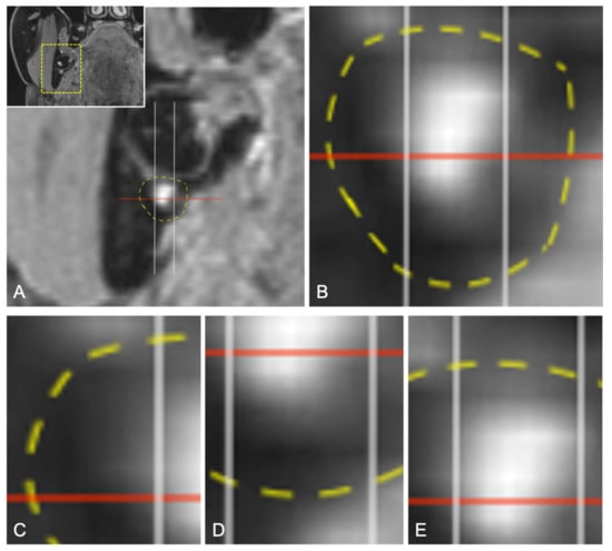 Figure 2. (A) Enlarged coronal reconstruction of the 3D-DESS images showing the mandibular third molar and the IAN (MRI signal hyperintensities) with its diameter (red line) located within the IAC (yellow line). (B) Enlargement of the evaluation. (C) If no part of the segment contains MRI signal hyperintensities of the IAN, it is considered non-visible. (D) If less than half to none of the segment’s volume is filled with MRI signal hyperintensities, it is considered non-visible. (E) If half or more than half of the segment’s volume is filled with MRI signal hyperintensities of the IAN, it is considered visible.