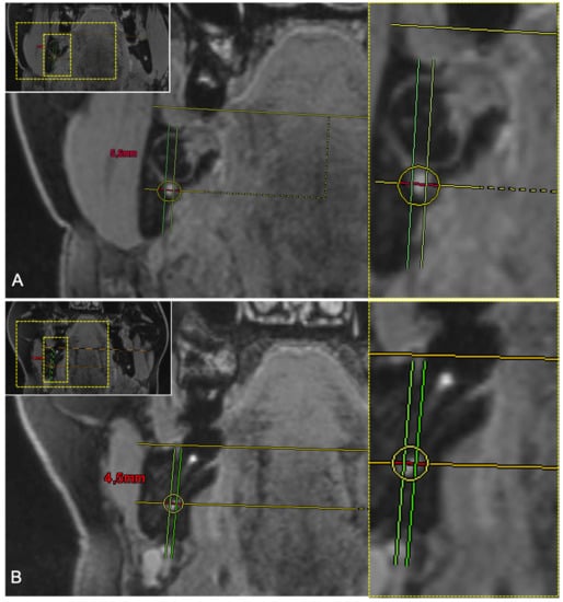 Despite the large inter-variability in terms of positional relationship to adjacent anatomical structures and various intraosseous branching, bilateral symmetry was observed between the right and left sides [32]. Besides, the intraosseous buccolingual IAC location was shown to be dependent on age and race [26]. There are no other studies investigating conversion factors between the two implemented imaging modalities to the authors’ knowledge. However, due to specialized tools such as mandibular coils [16,17] or mobile bedside MRI scanners, conversion factors may play an essential role in the future, which is why standardization should be considered.
