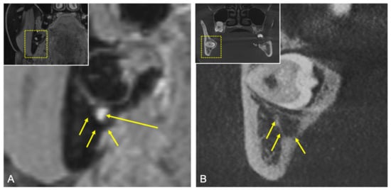 Figure 4. (A) Coronal reconstruction of the 3D-DESS MRI. For orientation, the dotted rectangles in the corner show the enlarged area. Short arrows showing the osseous boundaries of the IAC and the long arrow showing the MRI signal hyperintensities by the IAN’s tissue. (B) Coronal reconstruction of the CBCT. For orientation, the dotted rectangles in the corner show the enlarged area. Short arrows showing the osseous boundaries of the IAC.