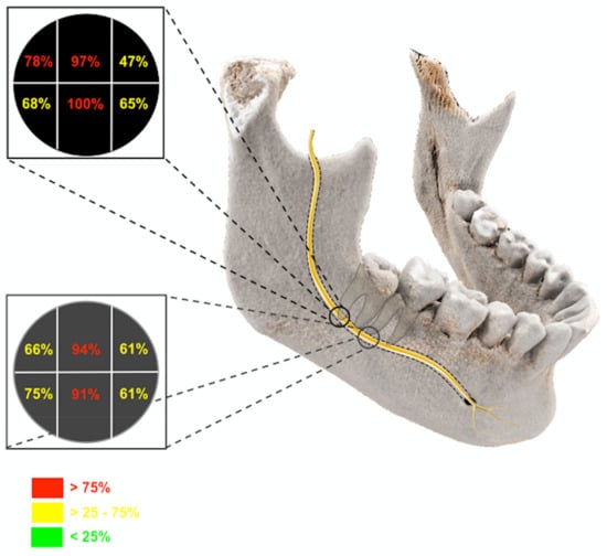 Table 3. Percentage of the IAN’s intraosseous position at the level of the second molar. In the presence of a hyperintense signal in a specific segment, it is noted whether other segments were simultaneously filled.