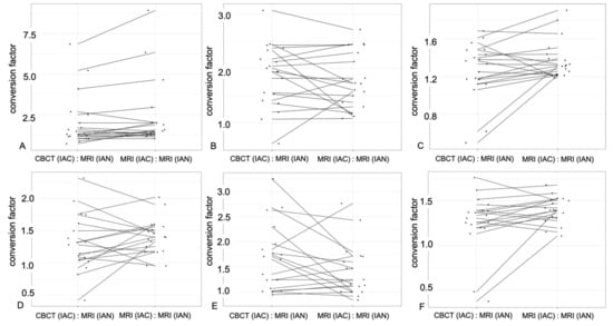 Figure 6. In these six plots, observations for the same subjects are connected by a line to visualize the differences between the two imaging modalities, CBCT and MRI, concerning the conversion factor in the corresponding planes. In the plots (A–C) (A, axial; B, sagittal; C, coronal), the evaluation at the third molar is visualized, and in the plots (D–F) (D, axial; E, sagittal; F, coronal), the evaluation at the level of the second molar is visualized. Thus, this graph visualizes the basis for the statistical inference using the one-sample Wilcoxon signed-rank test, which compares the difference in the two conversion factors.