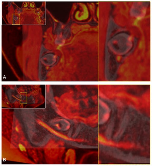 Figure 7. Fusion of a study participant’s 3D-DESS MRI (red) and CBCT (grey), demonstrating the good imaging quality. For orientation, the dotted rectangles in the corner show the enlarged area. (A) Coronal reconstruction showing the intraosseous position of the IAN (red, hyperintense signals) at the level of the third molar. (B) Sagittal reconstruction showing the intraosseous course of the IAN (red, hyperintense signals) at the level of the third and second molar.