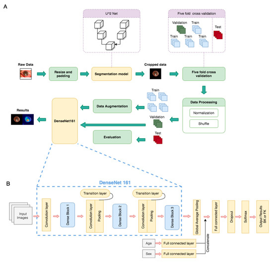 Deep learning framework for fungal keratitis diagnosis based on slit-lamp images. (A) Model architecture, including the segmentation model and classification model (DenseNet161). (B) Architecture of DenseNet161, which was the deep learning neural network selected as the basis for this study.