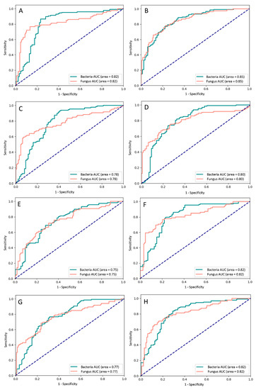 Receiver operating characteristic curves of the different deep learning models with (A) DenseNet121, (B) DenseNet161, (C) DenseNet169, (D) DenseNet201, (E) EfficientNetB3, (F) InceptionV3, (G) ResNet101, and (H) ResNet50. AUC—area under the curve.