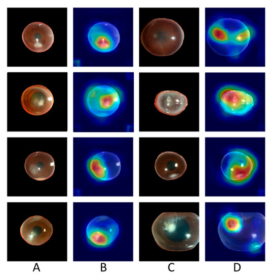 Sample heat maps generated by the model that correctly diagnosed patients as having bacterial keratitis and fungal keratitis. Column (A): images of fungal keratitis. Column (B): heat maps of the corresponding images in Column (A). Column (C): images of bacterial keratitis. Column (D): heat maps of the corresponding images in Column (C).