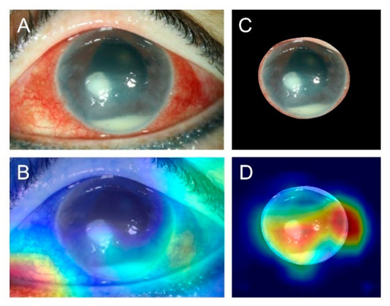 Sample images comparing slit-lamp with and without cropping. (A) Original slit-lamp image without cropping in an eye with bacterial keratitis. (B) Heat map generated by the model with the wrong prediction using the uncropped image showing the incorrect focus on the eyelid. (C) Cropped image from the slit-lamp image. (D) Heat map generated by the model with correct prediction using the cropped image showing the focus on corneal infiltration, corneal edema, and hypopyon.
