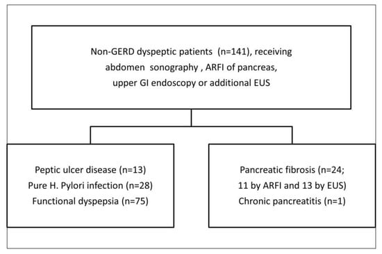 The infection rate of Helicobacter pylori is important for analyzing the dyspepsia population as per guideline recommendations [28]. Thus, the primary purpose of this study is to diagnose the percentage of each structural cause of dyspepsia, namely, pancreatic fibrosis (including early chronic pancreatitis), peptic ulcer disease, and Helicobacter pylori infection in the dyspeptic population. Consecutive patients were recruited from communities complaining of chronic dyspepsia with epigastric pain syndrome or postprandial distress syndrome after excluding cases with typical symptoms of gastroesophageal reflux disease (GERD).