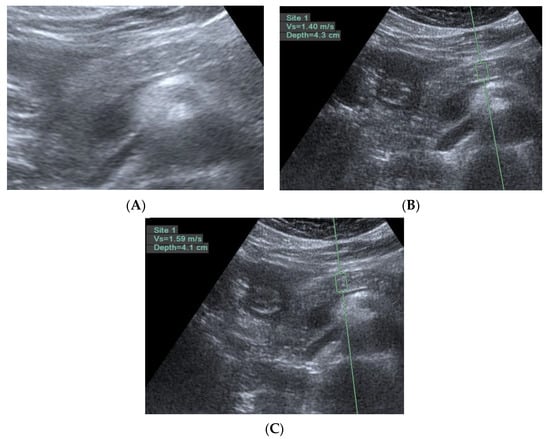 Three trans-abdomen sonographic images of the pancreas in the same patient. (A) Some hyperechoic foci in the pancreas; (B) if there are no hyperechoic foci in the region of interest, the pancreatic ARFI is 1.4 m/s; and (C) if there are hyperechoic foci in the region of interest, the pancreatic ARFI is higher (1.59 > 1.4 m/s).