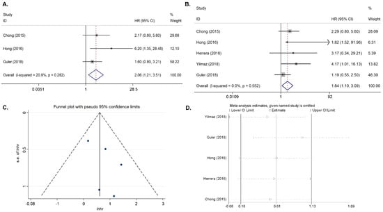 Four articles on primary tumor TLG were included in the study [13,16,18,19]. In the absence of a significant heterogeneity (I2 = 0%, p = 0.552), the fixed-effects model was applied. The combined HR for EFS with the primary tumor TLG was 1.843 (95% CI = 1.100–3.086, p = 0.02). (Figure 2B). The Begg’s funnel plot and Egger’s test indicated no publication bias (p = 0.261), and the sensitivity analysis showed that the analysis was relatively stable (Figure 2C,D).