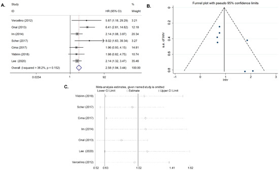 Seven articles on SUVmax in tumor tissue were included in the study [11,14,15,21,23,24,25]. Where there was a moderate heterogeneity (I2 = 36.2%, p = 0.151), the fixed-effects model was applied when pooling the HR. The combined HR was 2.582 (95% CI = 1.936–3.443, p < 0.001), which meant that patients with a high SUVmax had a shorter survival time than those with a low SUVmax (Figure 3A). Begg’s funnel plot and Egger’s test indicated no publication bias (p = 0.113), and the sensitivity analysis showed that the analysis was relatively stable (Figure 3B,C).