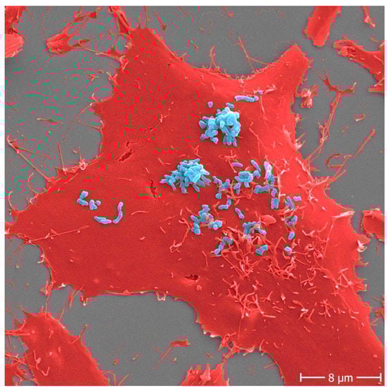 Adhesion of Bartonella henselae to human cells. B. henselae (strain Marseille) bacteria (light blue) in an early stage infection process (30 min) to human HeLa-229 cells (red). Adhesion to host cells is mediated by specific interactions between B. henselae surface proteins and components of the host extracellular matrix including molecules such as fibronectin or collagen. Scale bar: 8 μm.