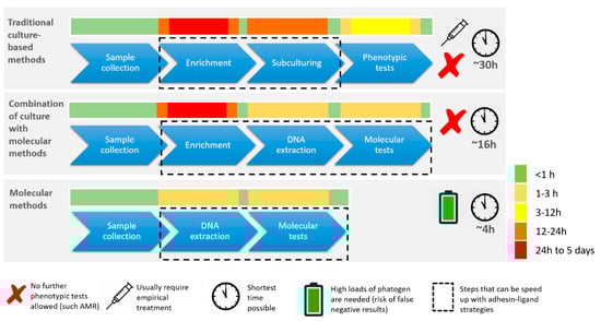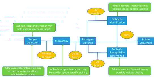 Diagnostic workflow and technologies (blue boxes) used for the routine detection of pathogens. Current timing is indicated in orange boxes whereas the possible impact of adhesion-based assays is indicated in green.