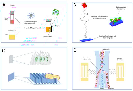 Adhesin–ligand interactions can be used to enrich pathogens from complex mixtures (e.g., fecal specimens, sputa, or urine samples) to a level where they would be clean and relatively easily detectable by classical tests. (A) Most common pre-enrichment methods make use of functionalized magnetic particles such as nanoparticles or beads, which bind to pathogens present in biological samples and are afterwards separated magnetically. (B) Surfaces functionalized with chemical cross-linkers and affinity ligands are used to directly capture bacteria with high specificity from biological samples. (C) Various types of nano-topographies such as prickly or nano-patterned surfaces, or nano-claws are used to capture bacteria. They are used alone or in combination with capture ligands. (D) Separation of bacteria from blood cells using surface acoustic waves in a microfluidic device. Other separation techniques such as viscoelastic separation are also used in microfluidic devices.