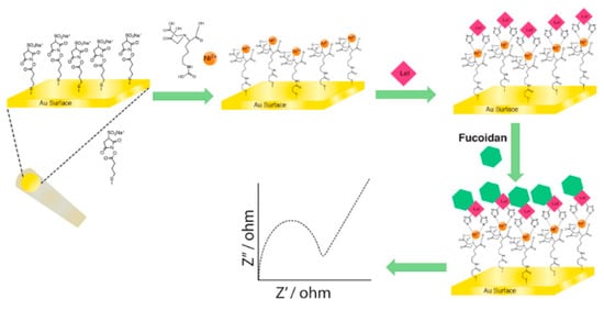 Illustrative representation of Lcl immobilization and fucoidan detection using EIS. A gold electrode was chemically modified after which nickel was electrostatically bound to the surface. This facilitated the binding of Legionella proteins, which were detected by electrochemical impedance spectroscopy (EIS). Reproduced with permission from [].