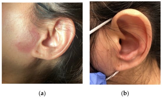 Figure 1. (a) Left preauricular lesion. (b) Left ear edema.