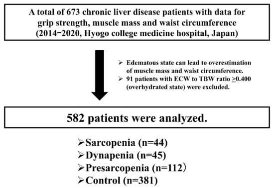 Our hospital involves one of the leading high-volume centers for liver diseases in Japan. Our patient population may not differ significantly from that of major centers in liver disease care in Japan [,,]. In our hospital, anthropometry measurements have been done when patient consent was obtained. The data for each patient have been consecutively recorded in our database. Between January 2014 and October 2020, a total of 682 CLD patients agreed to anthropometry measurements. Of these, 9 cases were excluded because some of the data for grip strength (GS), bioelectrical impedance analysis (BIA), and WC were missing. Thus, there were a total of 673 CLD patients with data for GS, muscle mass using BIA, and WC. All were outpatients with regular visits or inpatients in the Department of Internal Medicine, Division of Gastroenterology and Hepatology, Hyogo College of Medicine Hospital. An expert nutritionist assessed GS, muscle mass using BIA, and WC. BIA can reflect the severity of edematous status (i.e., extracellular water (ECW) to total body water (TBW) ratio). In cases of healthy individuals, ECW to TBW ratio can be maintained at a constant value (around 0.38) [,,]. WC can be overestimated by edematous status. Thus, 91 patients with ECW to TBW ratio ≥ 0.400 (overhydrated state) were excluded from the current analysis, and a total of 582 patients were included into analysis [] (Figure 1). The patients included in the analysis were not arbitrarily selected. The diagnosis of liver cirrhosis (LC) was based on clinical examination, biochemical, radiographic findings, and/or liver biopsy data.