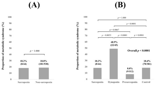 (A) Proportion of Met-S in patients with sarcopenia and non-sarcopenia for all cases (n = 582). (B) Proportion of Met-S in patients with sarcopenia, dynapenia, presarcopenia, and control for all cases.