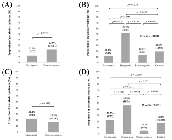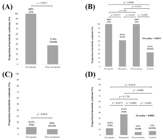 (A) Proportion of Met-S in patients with sarcopenia and non-sarcopenia in patients aged 65 years or more (n = 239). (B) Proportion of Met-S in patients with sarcopenia, dynapenia, presarcopenia, and control in patients aged 65 years or more. (C) Proportion of Met-S in patients with sarcopenia and non-sarcopenia in patients less than 65 years (n = 343). (D) Proportion of Met-S in patients with sarcopenia, dynapenia, presarcopenia, and control in patients less than 65 years.