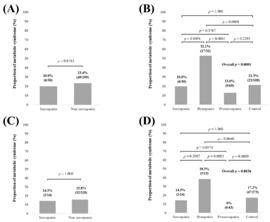 In patients aged 65 years or more (n = 239), no significant difference of the proportion of Met-S was observed in comparison of sarcopenia and non-sarcopenia (p = 0.8183, Figure 4A). Overall significance for the proportion of Met-S was found among the 4 groups (overall p value = 0.0001). p values between any two groups are demonstrated in Figure 4B. In patients aged less than 65 years (n = 343), no significant difference of the proportion of Met-S was observed in comparison of sarcopenia and non-sarcopenia (p = 1.000, Figure 4C). Overall significance for the proportion of Met-S was found among the 4 groups (overall p value = 0.0036). p values between any two groups are demonstrated in Figure 4D.