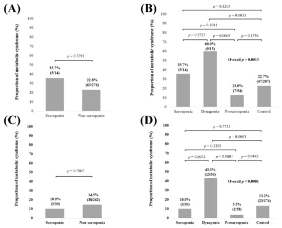 (A) Proportion of Met-S in patients with sarcopenia and non-sarcopenia in male patients (n = 290). (B) Proportion of Met-S in patients with sarcopenia, dynapenia, presarcopenia, and control in male patients. (C) Proportion of Met-S in patients with sarcopenia and non-sarcopenia in female patients (n = 292). (D) Proportion of Met-S in patients with sarcopenia, dynapenia, presarcopenia, and control in female patients.