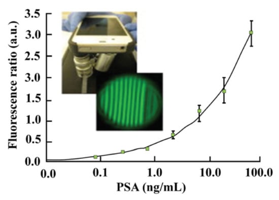 Nimse and co-workers used a portable smartphone-based fluorescence analyser to quantitively detect the prostate specific antigen (PSA) in the whole blood sample. The higher the PSA concentration is, the more intense the fluorescent signal is that is recorded [15].