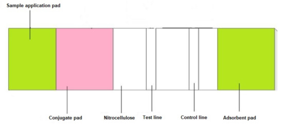 In the lateral flow paper strip, there are four main components: the sample pad, the conjugation pad, the reaction pad, and the adsorbent pad, as shown in Figure 2 [42,44]. (1) The sample is dropped on the surface of the sample pad which is often made of cellulose membrane or glass fibre. The porous structure absorbs and pre-treats the sample due to the specific requirements of the test, such as separating the sample into multiple layers, separating sample components, or removing the interferences [44]. The fluid layers are transported smoothly and continuously through the entire structure of the strip [42,44]. (2) The conjugation pad is comprised of the labelled biorecognition molecules, such as antibodies of latex beads, gold nanoparticles (AuNCs), and so on. Under the capillary effect, the sample fluid is transported from the sample pad to the conjugation pad and the antigen in the sample will react with the conjugate antibody to form the antigen/conjugate antibody complex [42,44]. (3) The antigen/conjugate antibody complex then travels to the reaction pad through the nitrocellulose membrane. In the reaction pad, there are at least two lines of specific antibodies called test and control lines, as shown in Figure 2. The antibodies in the test and control lines can capture the target analytes in the fluid samples and then develop colour to indicate the presence of the biological markers in the samples [42,44]. (4) The absorbent pad plays the role of a sink at the end of the strip. It maintains the flow rate of the solution within the strip, absorbs the residual solution after it flows through the whole structure of the strip, and prevents the solution from flowing back toward the sample pad [44]. All four pads are mounted on a back-support card which is independent of the solution interaction with the cellulose membrane, so it will not affect the flow rate of the fluid, or the reactions between the analytes and the antibodies in the membrane and the sample. Therefore, the back-support card only has the role of securing the positioning of the four pads and assisting with strip handling [44].