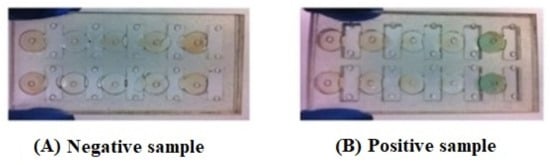 The results of the prostate cancer detection by using the HRP substrate [ABTS (2,2′-Azinobis [3-ethylbenzothiazoline-6-sulfonicacid]-diammonium salt) to track the presence of the prostate specific antigen (PSA) in serum, (A) the negative sample (No PSA) where the HRP substrate still stays as a red colour and (B) the positive result (PSA presence) where the HRP substrate develops a green colour [46].