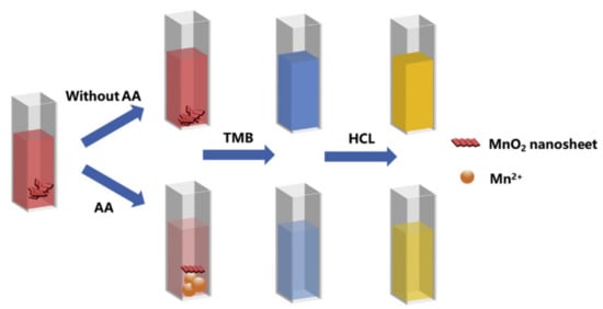 Although operating differently from the paper-based microfluidic platform, liquid-based biomarker detections also follow similar principles in that the obtained results come from reactions between the target biomarkers and the detecting agents. Some liquid-based biomarker detections are now presented for colorimetric, fluorescence, and chemiluminescence methods for portable testing systems. Chen et al. [52] applied ELISA into colorimetric detection to measure bovine serum albumin (BSA) in serum by developing a microfluidic platform, allowing the reagent of 4:1 VHH/horseradish peroxidase (VHH/HRP) to react with BSA under the support of phosphate buffered saline. The developed colour images are captured by a smartphone camera and sent to an Arduino microcontroller to analyse the RGB values in the BSA concentration in the serum sample. The smartphone is used for colour-shifting imaging only, not for signal analysis. Kong et al. [5] reported a smartphone-based microchip for tracking ascorbic acid (AA) in serum. Serum is injected into a quartz cuvette which is located inside the measuring device. MnO2 is added to the serum sample, followed by the addition of TMB and HCl to shift the solution’s colour from red to blue and yellow respectively, as shown in Figure 5. The presence of ascorbic acid in the serum enhances the solution’s colour intensity. A smartphone is used to capture colour pictures and customised software is installed on the smartphone to analyse the HSV values, then the correlation between the colour intensity and the AA concentration can be established. The limit of detection for AA in serum is 0.4946 µM.