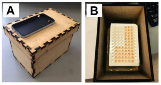 (A) The overview of the wooden dark-box with the iPhone case attached on the top so that the phone’s camera can take a picture of the solution plate inside. (B) The 96-well plate containing the detecting reagent and the sample is placed inside the box for taking chemiluminescent images [55].