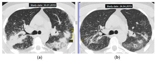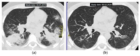 Pulmonary sarcoidosis, stage II, atypical form—multiple massive consolidations in both lungs; a thoracic CT scan (axial section at the level of division of the main bronchi): (a) on the left—before treatment, (b) on the right—after 12 months of MTX therapy, 15 mg/week (complete resolution with residual changes in the form of limited interstitial fibrosis).