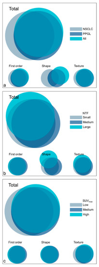 Venn diagrams representing the overlap in affected features per feature class for the cohorts (a) and subgroups ((b): NTF, (c): SUVmax). NSCLC: non-small cell lung carcinoma, PPGL: pheochromocytoma and paraganglioma, NTF: necrotic tumour fraction, SUVmax: maximum standardised uptake value.