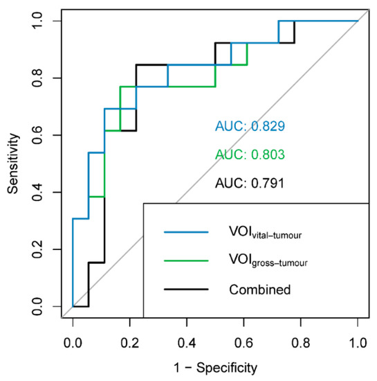 ROC curves and AUCs for the different radiomic models: blue: VOIvital-tumour (features: first order minimum, shape surface area and GLCM informational measure of correlation 2); green: VOIgross-tumour (features: shape surface area, NGTDM complexity and GLDM dependence entropy); black: combined (features: VOIgross-tumour GLCM sum entropy, VOIvital-tumour shape maximum 3D diameter and VOIvital-tumour shape surface volume ratio). ROC: receiver operating characteristic, AUC: area under the ROC curve.