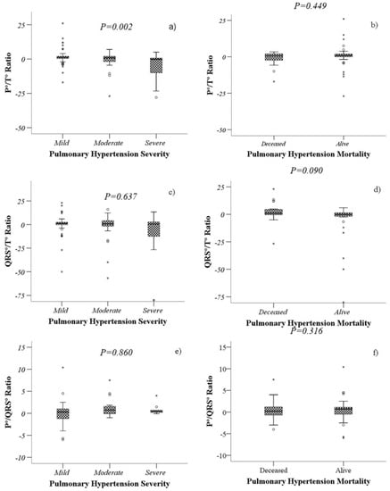 A lower P°/T° ratio was associated with severe PH (p = 0.007), while a higher QRS°/T° ratio was associated with higher mortality (p = 0.038). The P°/QRS° ratio did not show statistical significance with either mortality or severity (Figure 2).