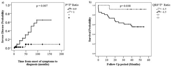 Kaplan–Meier curves comparing severity (a) and survival (b) proportions of patients with PH by P°/T° ratio (<0.99 vs. >1.0) and QRS°/T° ratio (<−1.5 vs. >1.5), respectively.