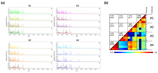 Comparison of MALDI-TOF MS profiles from saliva samples pre-treated with distinct protocols. (a) Representative MS spectra from saliva, collected in plastic tube, of four healthcare workers (#1 to #4) per condition of preparation (protocols A to D). a.u., arbitrary units; m/z, mass-to-charge ratio. (b) Assessment of saliva spectra reproducibility for sample pre-treated with distinct protocols using composite correlation index (CCI). The levels of MS spectra reproducibility are indicated in red and blue, revealing relatedness and incongruence between spectra, respectively. CCI are expressed as the mean ± standard deviation. CCI-values per individuals among the different protocols were indicated in bold. A: Saliva diluted with 1 vol. of water; B: A + 1 vol. of Mix buffer; C: 100 µL of A + 400 µL absolute ethanol at −20 °C overnight (ON), centrifugation and pellet re-suspended with 100 µL of Mix Buffer; D: 100 µL of A + 400 µL ACN at −20 °C ON, centrifugation and pellet re-suspended with 100 µL of Mix Buffer. #1–4: healthcare workers.