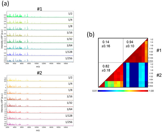 MS profiles of serial dilution of saliva from healthcare workers. (a) Representative MS spectra of serial dilution of saliva, collected in plastic tube, prepared according to protocol B from two individuals. The dilution rate is indicated at the right part of each profile. (b) Composite correlation index (CCI) matrix representing the levels of MS spectra reproducibility between saliva samples. CCI are expressed as the mean ± standard deviation. #1 and #2: healthcare workers.