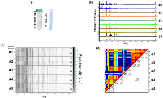Comparison of saliva MS profiles from healthcare workers collected with two distinct systems. (a) Representation of the two saliva collection systems used. (A) Plastic tube; (B) Salivette®. (b) Representative saliva MS spectra collected either directly in plastic tube (A) or in a Salivette system (B) from five healthcare workers. (c) Gel view of the saliva MS profiles from the same five healthcare workers. The four replicates loaded on the MS plate for each individual per saliva collection system are presented. The gray scale in the right part of the panel correspond to the MS peak intensity level in arbitrary units (a.u.). (d) Composite correlation index (CCI) matrix representing the levels of MS spectra reproducibility between saliva samples. CCI are expressed as the mean ± standard deviation. #1 to #5: healthcare workers.