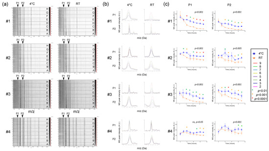 Saliva contains numerous enzymatic proteins involved in the food digestion, which could also induce proteolysis of saliva proteins [29]. Thus, saliva storage conditions and duration of storage are factors which may alter the integrity of the proteins and thereby the respective MS profiles. In order to determine the optimal parameters, saliva from four individuals (three males and one female, mean age ± SD: 38.0 ± 8.0) was collected with the Salivette system and stored either at 4 °C or RT (about 20 °C) and finally loaded onto a MS plate to compare the stability of MS profiles as a function of storage mode and duration. After storage of the saliva samples for 24 h, even at 4 °C, a dramatic change in the MS profiles was observed, confirmed by CCI-based analysis (CCI values < 0.8, Figure S2). The acquisition of the MS spectra can therefore not be performed the consecutive day of sample collection and stored in these conditions. In order to specify the retention periods of saliva samples over one day, sequential analyzes of the MS profiles carried out every hour were compared. On the gel view (Figure 4a), reproducibility of MS spectra was observed, notably for samples stored at 4 °C for more than 8 h. Nevertheless, it seems that a decrease in the intensity of the MS profiles occurred with the increase of the storage time of samples. To assess this phenomenon, the intensities of two MS peaks shared among individuals, P1 and P2 at about 4372 and 6952 m/z, respectively, were compared. Although the saliva MS profiles from one individual (#4) appeared to be little altered by the duration and storage mode, the overlays of the P1 and P2 MS peaks revealed a decrease in intensity for saliva from three other individuals (#1 to #3) (Figure 4b). The proportion of peak intensity decrease reached more than 89% for P1 (#1 and #3) and 90% for P2 (#1) after 9 h of storage at RT (Figure 4c). Pairwise comparison highlighted significant decreases in peak intensities for P1 and P2 (1-way ANOVA, followed by Fisher’s LSD, p < 0.01) starting at about 2–4 h after sample collection at RT compared to 4 °C. Interestingly, the intensity of the P1 and P2 peaks of saliva stored at RT during 4 h were lower than of those of paired samples preserved at 4 °C during 9 h (Figure 4c). These important decreases in peak intensity at RT led to the loss of several MS peaks (Figure 4a). Overall, these results revealed that saliva samples stored at RT could compromise the detection of MS peaks. In this sense, storing of Salivette at 4 °C until sample treatment during the working day appeared as the most efficient conditions prior to saliva analysis by MS profiling.