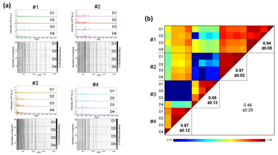 Inter-day reproducibility of saliva MS profiles from healthy individuals. (a) Representative saliva MS spectra and gel view of saliva MS spectra from four distinct healthy individuals (#1 to #4) collected with Salivette devices during four successive days (Day, D1, D2, D3, and D4). Per collection day, one MS spectra and the four replicates loaded on the MS plate for each individual are presented on the graphic and gel view, respectively. The gray scale in the right part of the panel correspond to the MS peak intensity level in arbitrary units (a.u.). (b) Composite correlation index (CCI) matrix representing the levels of MS spectra reproducibility between saliva samples. Bold numbers correspond to CCI values obtained for each individual in successive days. CCI are expressed as the mean ± standard deviation. #1 to #4: healthcare workers.