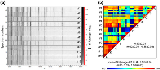 Saliva MS profiles from 12 healthcare workers. (a) Gel view of saliva MS spectra from 12 distinct individuals. The four replicates loaded on the MS plate for each individual per are presented. (b) Composite correlation index (CCI) matrix representing the levels of MS spectra reproducibility between individuals. The values correspond to the mean coefficient correlation and respective standard deviations obtained for paired condition comparisons. CCI are expressed as the mean ± standard deviation. #1 to #12: healthcare workers. A to L: assessment of individual MS spectra reproducibility.