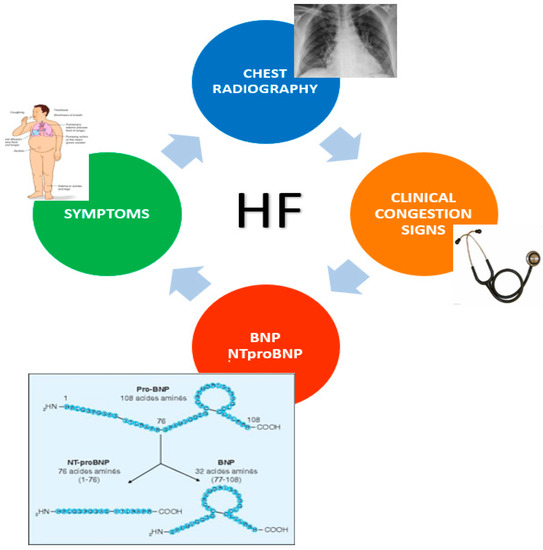 Traditional diagnostic screening for congestion detection in HF: current criteria are based on signs and symptoms, NPs measurement, and chest radiography.