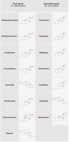Another forensic toxicological approach to AAS measurement involves the extraction of their phase II metabolites. This process could increase the sensitivity of the technique. A phase II metabolite of methandienone was recently analyzed and the authors stated that it could be used as a long-term marker of this substance (up to 26 days after single oral administration) [,]. In addition to liquid biological samples, the toxicological analysis of AAS can also be performed on hair. The extracted hair should be decontaminated in two dichloromethane baths (5 mL, 2 min). The organic phase is obtained after centrifugation and should be collected, evaporated, and diluted with phosphate buffer pH 7.0 (part a). The hair remaining on the bottom of the tube is collected and then hydrolyzed with 1 mL of 1 M NaOH (part b). In both parts (a and b), the liquid–liquid extraction is performed with 2 mL of ethyl acetate. After further processing, androstenedione, testosterone, boldenone, tetrahydrogestrinone, methandienone, methenolone, methyltestosterone, nandrolone, oxandrolone, chlorodehydromethyltestosterone, stanozolol, and trenbolone should all be tested by LC–MS–MS. Esters (testosterone, nandrolone, and drostanolone) should be tested by GC–MS–MS [].