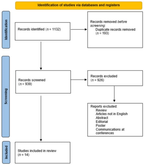 A total of 1132 articles were collected. Of these, 193 duplicates were removed. A total of 939 articles were screened and 926 did not meet the inclusion criteria. In conclusion, 14 articles were included in this systematic review (Figure 3).