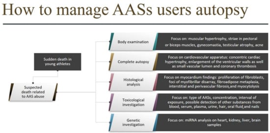 When an autopsy is performed in a sudden death case involving a young athlete, the focus of the examination should be on the physical phenotype, such as muscular hypertrophy, striae in pectoral or biceps muscles, gynecomastia, testicular atrophy, and acne. To suggest AAS abuse, a complete and detailed autopsy of all the cardiovascular apparatus, with a focus on the heart, is mandatory. The chemical–toxicological analysis is a crucial tool to assess the link between sudden cardiac death and AAS abuse []. Autopsy plays a pivotal role in the study of AAS adverse effects and organ damage related to their use/abuse. Moreover, autopsy studies may provide useful information regarding the pathophysiology of the effects of long-term administration of AASs; therefore, autopsy practice should be implemented in suspected AAS-related deaths [,]. The forensic community needs a unified approach in cases of suspected death related to the use of AASs. There are several occasions to apply this workflow, for example in cases of bodybuilders and young people who died in gymnasiums or during a sport activity.