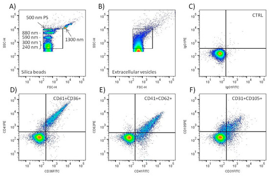 Flow cytometry analysis of large EVs in cord blood plasma. Standard silica and polystyrene (PS) beads were utilized to create EV gate in the SSC-H/FSC-H scattergram (A). Typical scattergram signal of cord blood plasma extracellular vesicles (B). Only events inside the gate were analyzed. Representative density plot of negative control sample (CTRL) labeled with isotype IgG1 control MAbs (C). Representative density plots of samples labeled with CD41 PE + CD36 FITC (D), CD41 FITC + CD62 PE (E), and CD31 FITC + CD105 PE (F) MAbs. Only double fluorescence positive events in the upper right quadrant were included in the analysis.