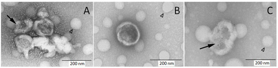 Immune electron microscopy demonstrates the presence of platelet EVs in cord blood plasma. Samples were labeled with CD41 PE MAb and secondary antibody conjugated with colloidal gold followed by staining with uranyl acetate. Some of visualized EVs are decorated with colloidal gold ((A,C) black arrow) and some are non-labeled (A,B). The round hollow structures are artifacts present on carbon grids (arrowhead).