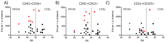 Platelet and endothelial EVs were defined as events inside the EV gate and double positive for the cell specific markers (Figure 1). Agreement between the counts of EVs in the two independently labeled sample aliquots was satisfactory. Within 90 measured aliquot pairs, 69 (76.7%) had a difference from the mean count less than 10% (average 4.4 ± 2.9%), and, out of 21 pairs with a difference above 10% (average 13.6 ± 4.4%), only one pair differed more than 20% (29.2%). No significant differences in the count of platelet (CD41+CD36+), activated platelet (CD41+CD62+), and endothelial (CD31+CD105+) EVs between PRTM and CTRL groups were identified. The number of detected EVs in individual samples was relatively low, ranging from less than 100 to almost 3000 EVs/µL of plasma. Platelet EVs were approximately twice as much numerous as activated platelet and endothelial EVs (Figure 3 and Table 2). The counts of studied large EVs did not correlate with gestational age at delivery. Samples with hemoglobin concentration >0.1 mg/mL (n = 7) displayed notably higher counts of platelet and activated platelet EVs than the rest of the samples (Figure 3). Exclusion of the hemolytic samples from the comparison of EV counts did not lead to significant differences between PRTM and CTRL groups).