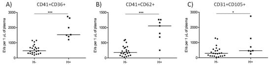 Counts of large EVs in hemolytic (H+) and non-hemolytic (H−) cord blood plasma samples. Platelet ((A) CD41+CD36+), activated platelet ((B) CD41+CD62+), and endothelial ((C) CD31+CD105+) EV counts in hemolytic (H+; squares, n = 7) and non-hemolytic (H−; circles, n = 23) samples. The medians are shown. * p < 0.05, *** p < 0.001.